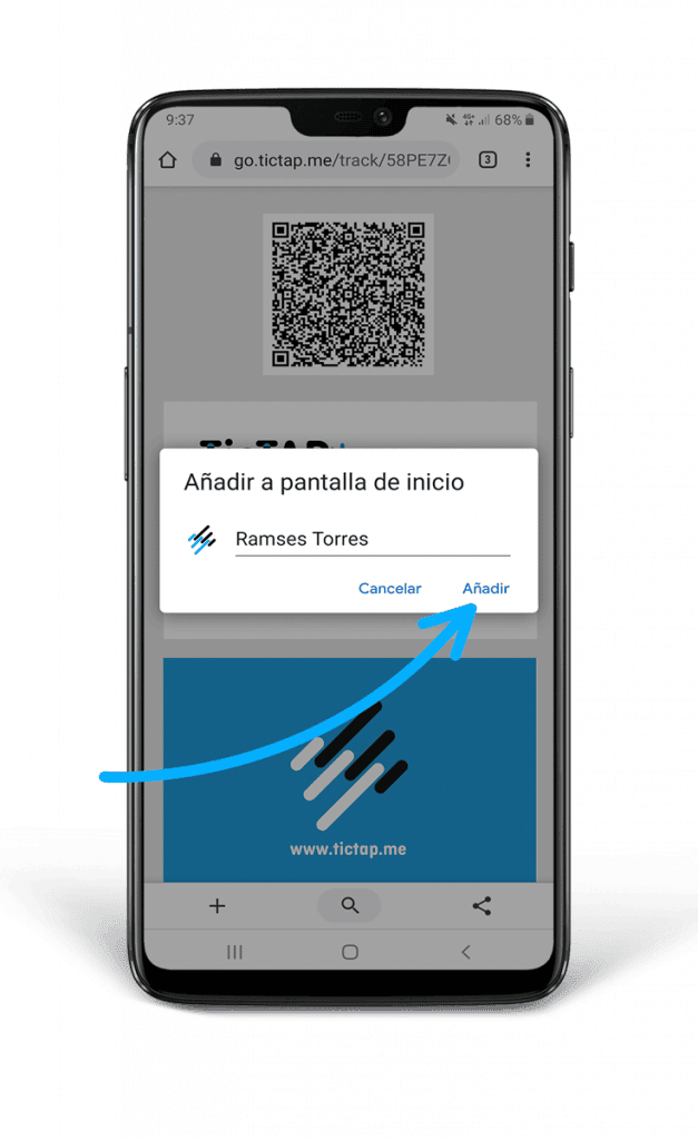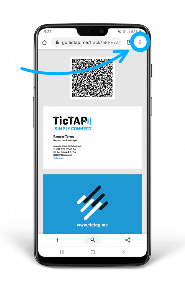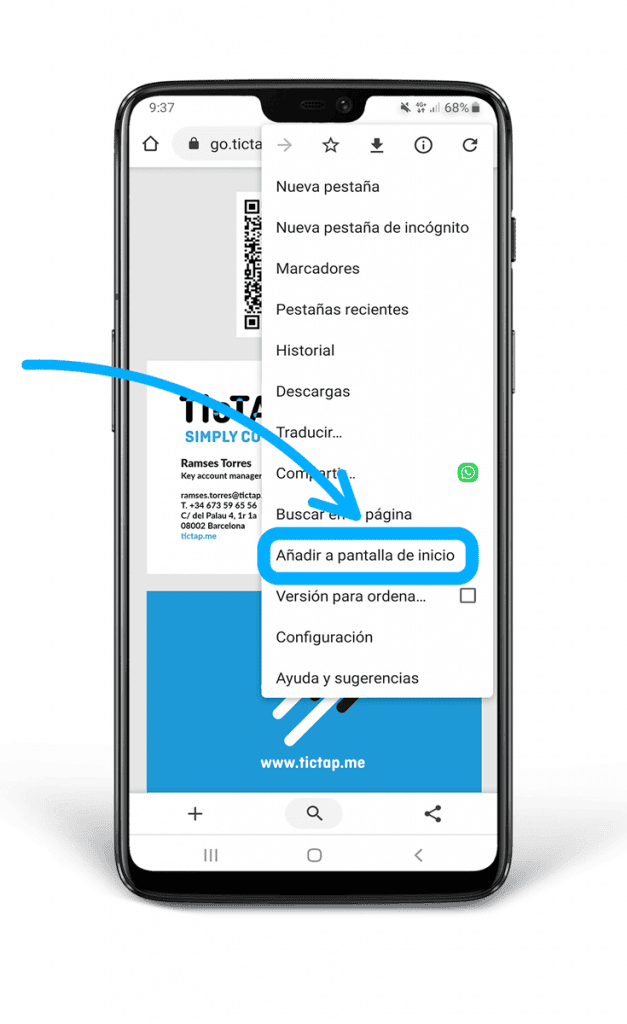 ¡Añade Vcards a tu escritorio en 3 sencillos pasos! Android 1. Pulsa sobre el menú, los tres puntos de la esquina superior derecha. 2. Elige ‘Añadir a pantalla de inicio’. 3. Escribe un nombre para el icono, éste se añadirá en forma de icono en la pantalla de inicio para permitir un acceso más rápido a tu vcard.